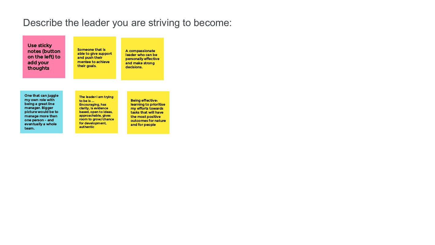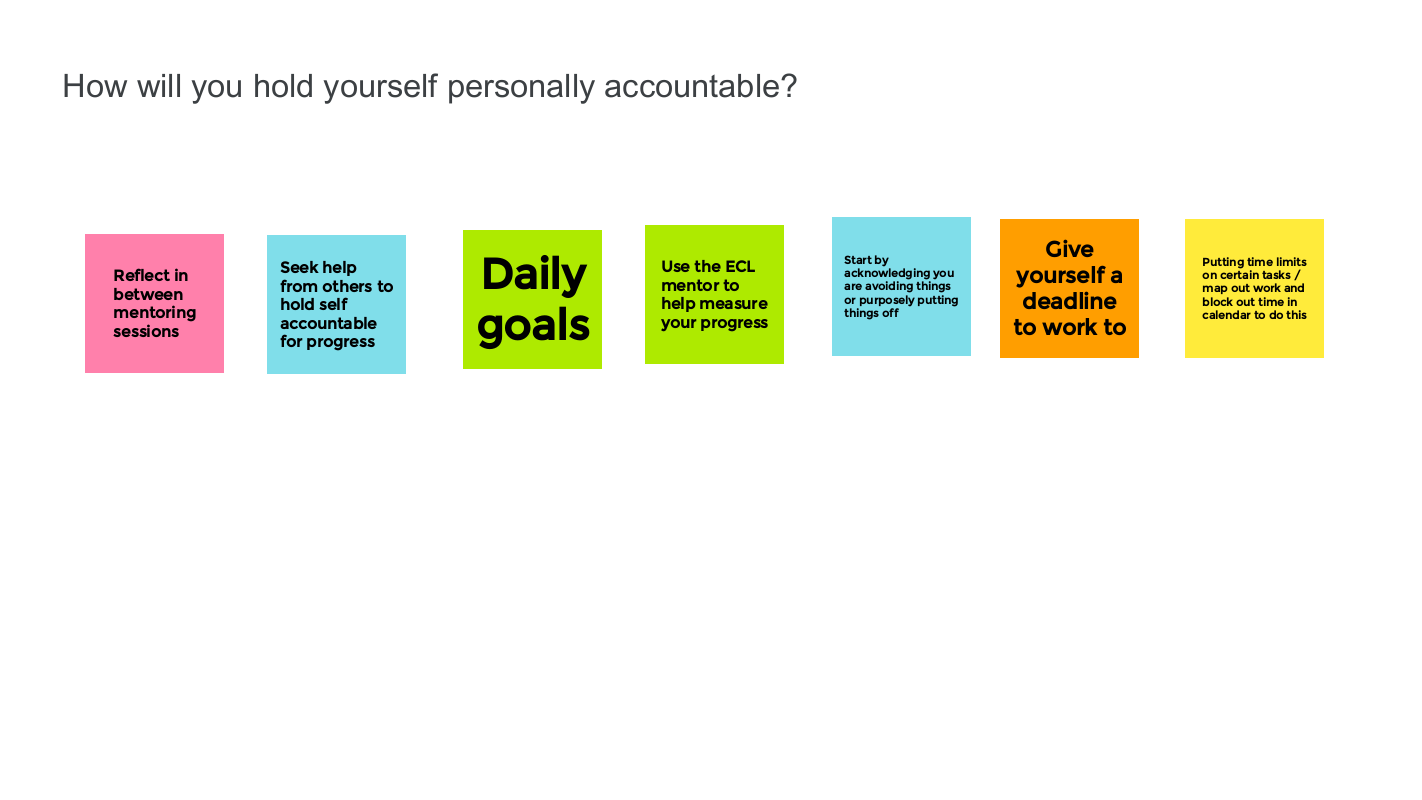 1. How will you hold yourself personally accountable in achieving your leadership goals? (Do you need someone to help you hold yourself accountable – e.g. your mentor, line manager, a peer?)