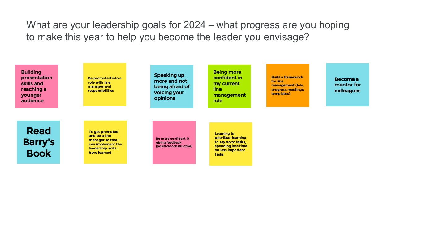 3. What are your leadership goals for 2024 – what progress are you hoping to make this year to help you become the leader you envisage? (Focus on a limited number of clear, relevant, timely objectives).