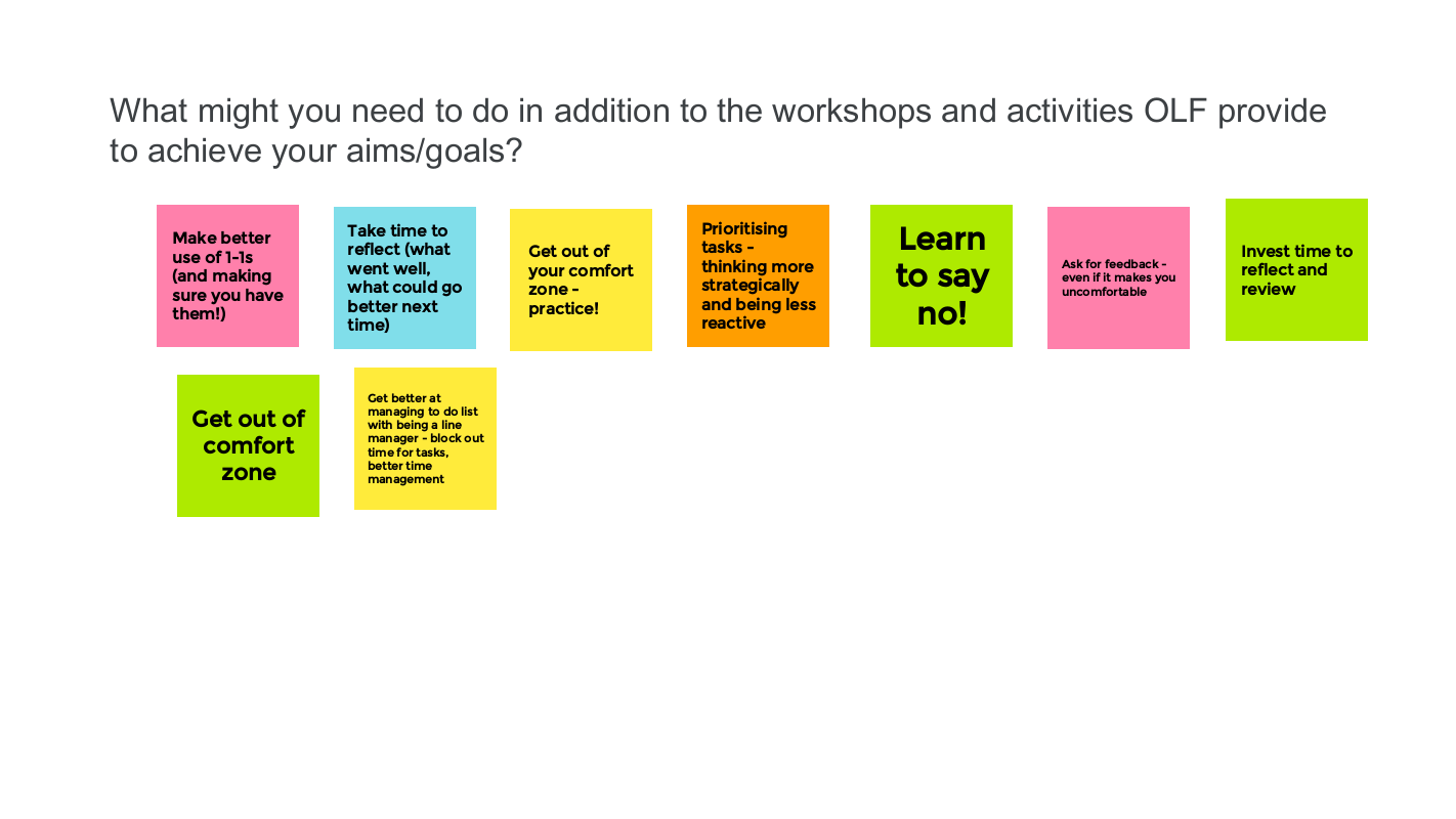 1. What might you need to do in addition to the workshops and activities OLF provide to achieve your aims/goals? (think about how you will practice your leadership skills in the real world)